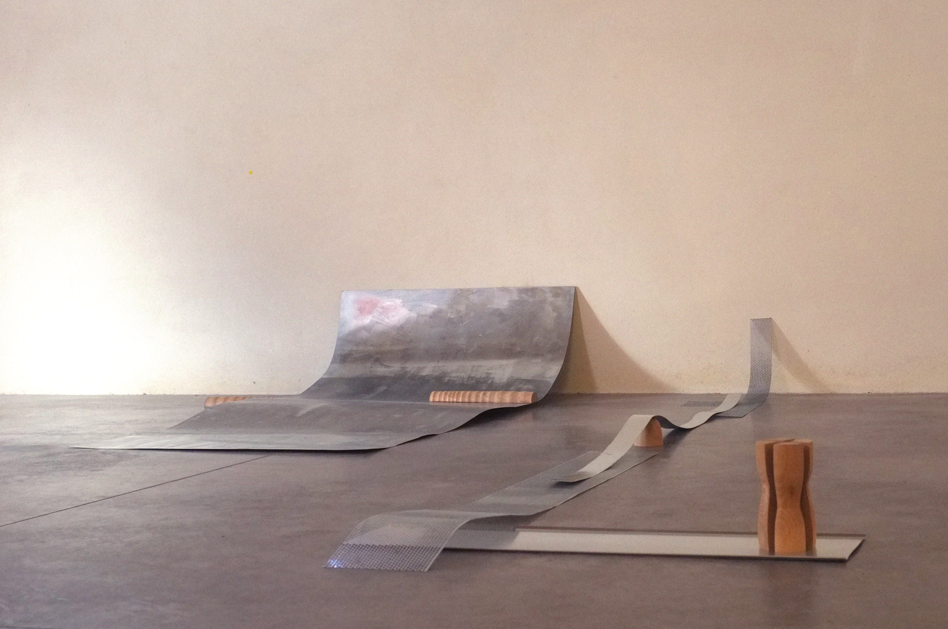 Les œuvres Objets suspendus (2023) et Sleeping Oak (2024), prolongent cette réflexion. Par leur forme détournée – entre mobilier domestique et sculpture abstraite –, elles deviennent des objets ambigus, oscillant entre familiarité et étrangeté. Ni tout à fait outils du quotidien, ni tout à fait sculptures, ces pièces semblent en attente d’une altérité. Entre corps absent et simulacre de foyer, la sculpture Heating Ghost (2023) incarne, elle aussi, le lien entre espace intime et espace fictionnel. Figure vaporeuse et flottante, elle évoque à la fois la chaleur du foyer et le souvenir flou d’un espace habité.